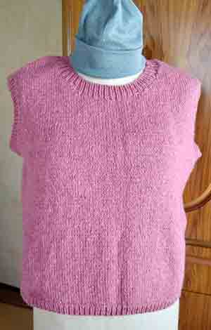 | 極細2本どりで編みました。限られた糸なので、何度か編み直しもあり、衿、袖、袖は編み機で仕上げました。 | ちょっとオシャレな感じに出来上がったチョッキです。 |